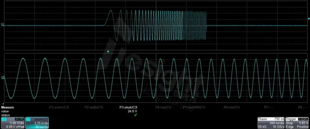 在实际测试配置中,CMUT安装的PCB置于模拟水下环境的容器中(常用植物油),水听器放置在距离CMUT几毫米处测量传递的声压并转换为电压信号。TS-AWG4000提供精确的驱动脉冲,是实现这一测试闭环的关键环节。