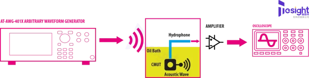 在实际测试配置中,CMUT安装的PCB置于模拟水下环境的容器中(常用植物油),水听器放置在距离CMUT几毫米处测量传递的声压并转换为电压信号。TS-AWG4000提供精确的驱动脉冲,是实现这一测试闭环的关键环节。