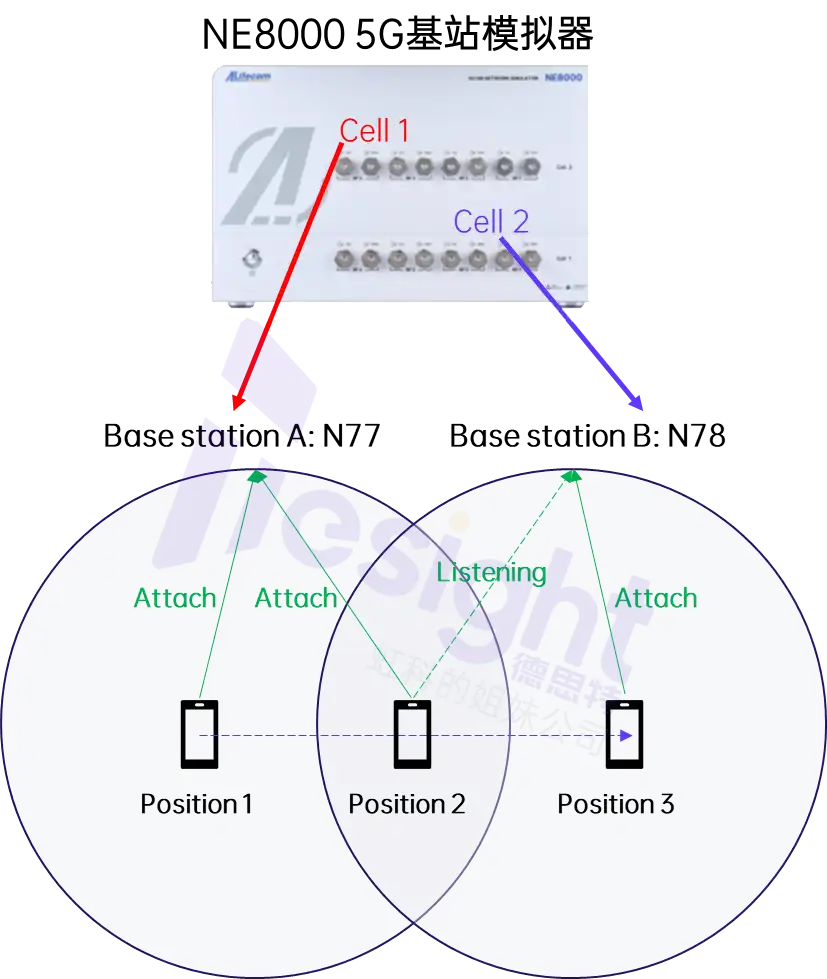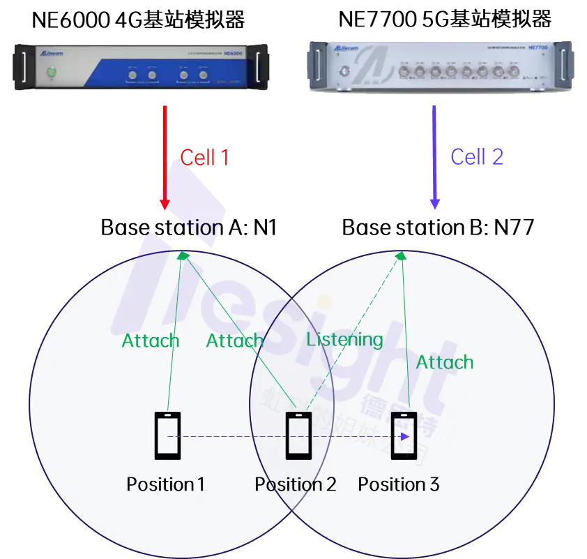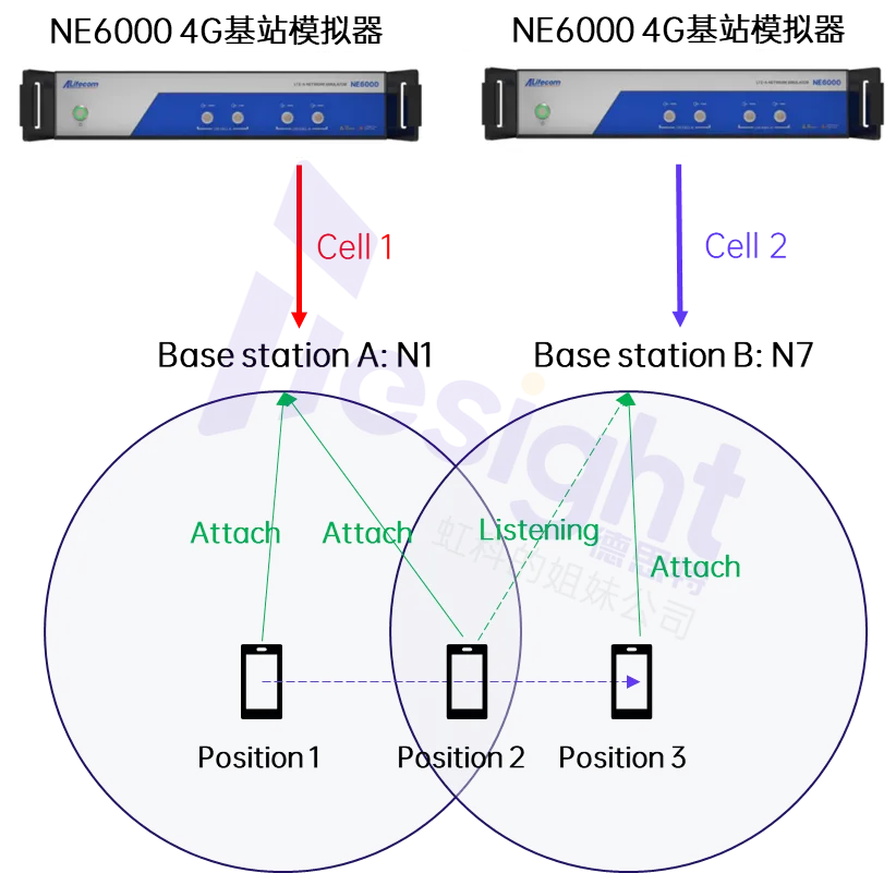 另一种方案是利用两台基站模拟器分别构建独立的小区环境,通过改变信号强度或模拟UE的运动状态,让终端在两个小区之间实现网络切换,如下图所示: