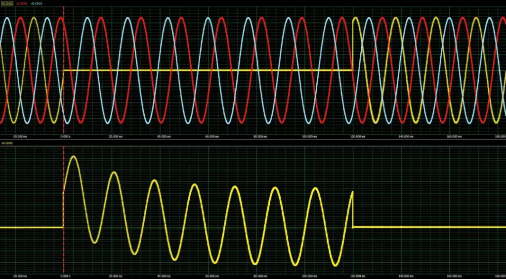 示例2展示了通过模拟电压和电流传感器输出电路故障检测的波形。上轨迹模拟了 A 相发生线对地故障时的三相电源电压变化,下轨迹则呈现对应的 A 相故障电流波形,充分体现了DDS选件在生成非正弦波形(如指数衰减电流)方面的能力。