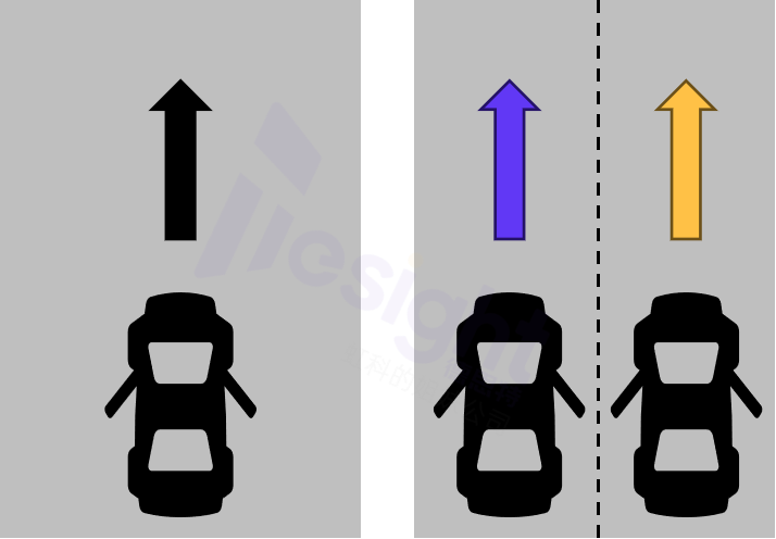 因此,为了提高车辆通行效率,一种方法是在原来道路的基础上,将原先的单车道变成双车道或多车道,且各车道间的距离为0,仅用地上的导流线划分,如图所示。此时,道路上就可以同时容纳两辆或多辆车并排行驶,通行效率大大提升。