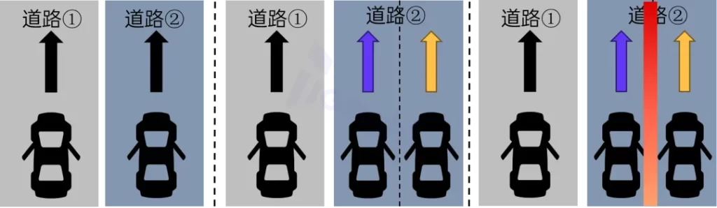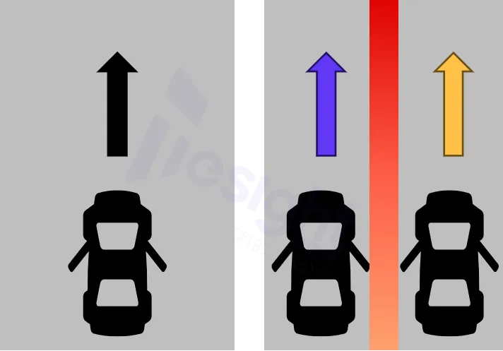 同样用道路和车道来表示:在原来道路的基础上,在其中间挖一条隔离带,使得车道①和车道②相互独立,各车道内的车辆仅能在本车道内行驶。这样车辆在行驶过程中也可有效提升通行效率。