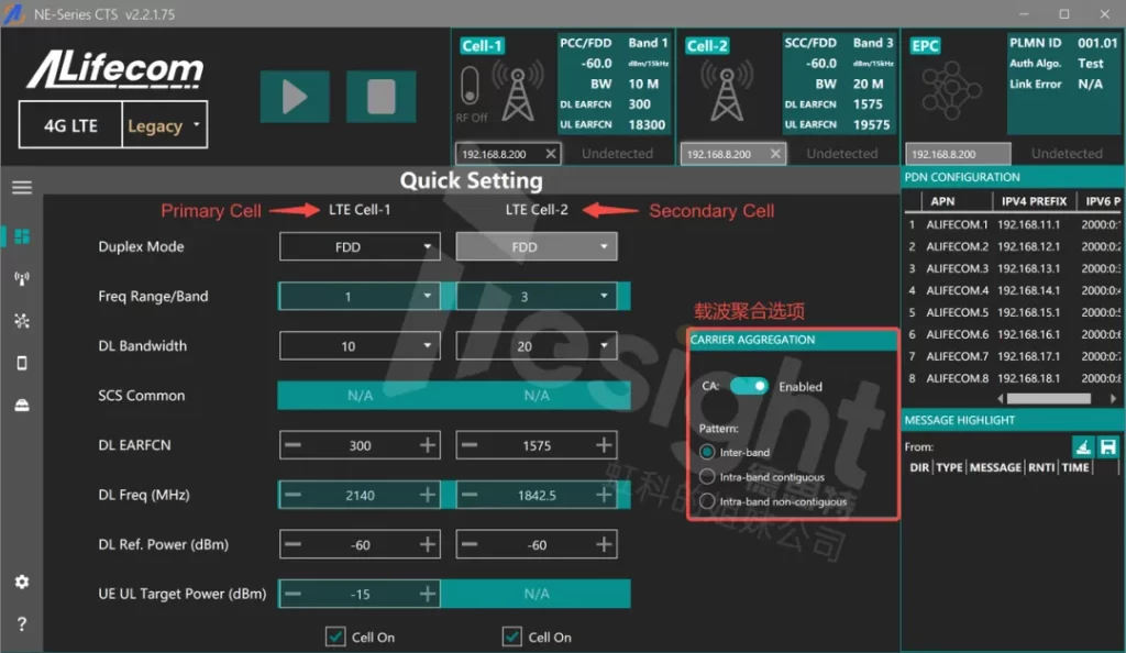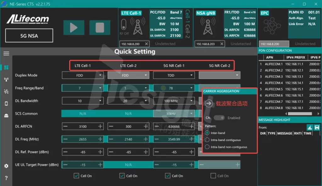 德思特ALifecom基站模拟器可支持4G/5G蜂窝网络下的CA测试。其中,NE6600 4G基站模拟器单机支持LTE 2CC载波聚合。如图1所示,用户仅需在软件端配置主小区PCell的载波分量(1CC-PCC),指定其工作频段和带宽以及发射信号功率后,点击开启载波聚合选项,并选择载波聚合类型(例如频段内连续CA、频段内不连续CA或频段间CA),从而配置一个附属小区SCell的载波分量(1CC-SCC),最终形成LTE 2CC载波聚合。测试时首先终端与基站模拟器间完成网络附着,此时仅建立PCell连接,之后在RRC重配置时添加SCell和SCC,触发CA建立。