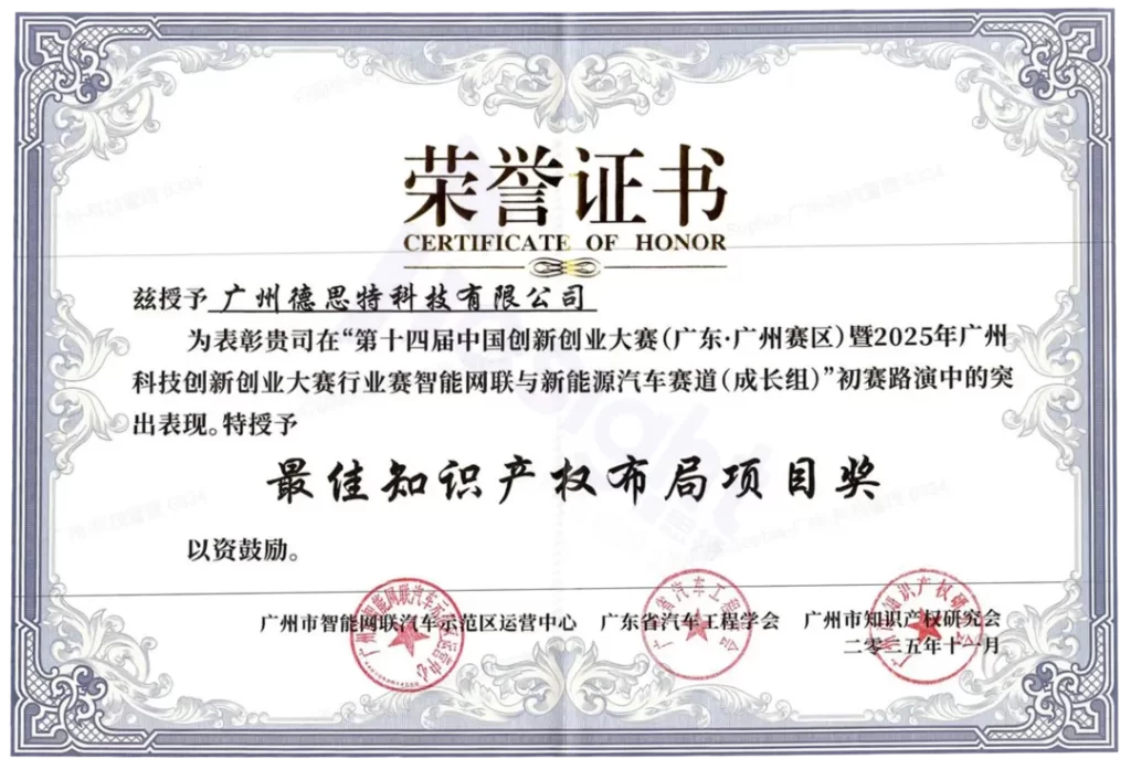 广州市智能网联汽车示范区运营中心领导一行专程莅临德思特广州总部,进行指导交流,并颁发了一个专项荣誉——“最佳知识产权布局项目奖”。
