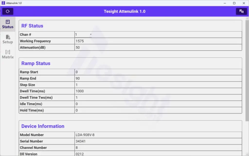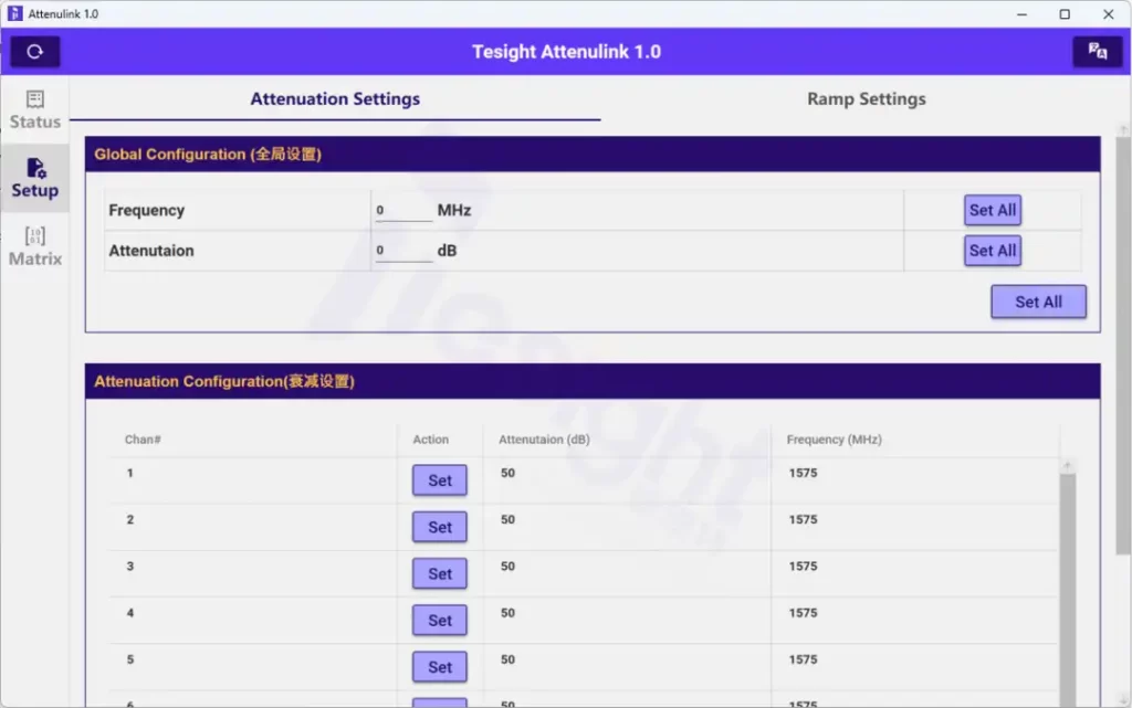 德思特自研多通道衰减器控制软件Tesight Attenulink的Status界面可将硬件的相关信息以及状态同步显示,Setup界面则可通过Set All一键完成所有通道的参数设定,也可根据实际需求逐一改变通道频率和衰减值的设置。操作简单,功能多样。