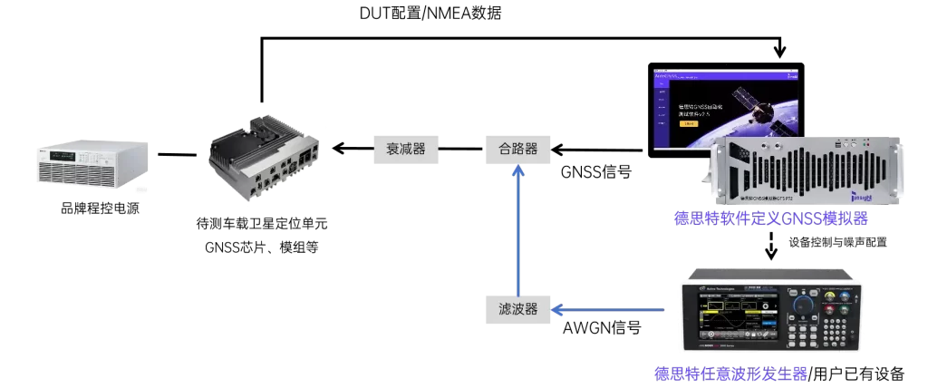 在进行射频信号协调部分的测试时,德思特可按照标准要求,提供外部的干扰信号发生器产生AWGN信号并在外部进行合理发送给待测件,在该配置中:
