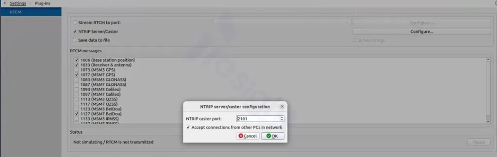 ③设置RTK基站传输类型为“Ntrip”,设置传输端口为“2101”,允许本地计算机访问,传输RTCM消息类型设置为: