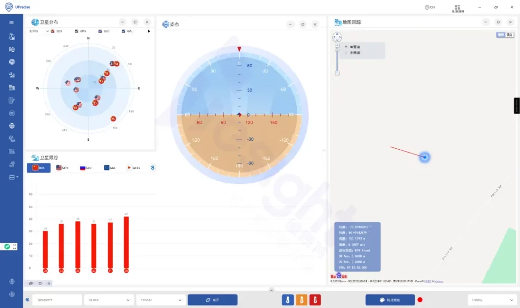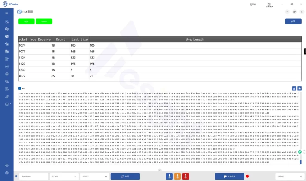 ①在准备好的PC上连接UM982接收机,打开Uprecise,在上方receiver选择对应串口号,设置波特率模式为:“Autobauding”,等待连接成功。