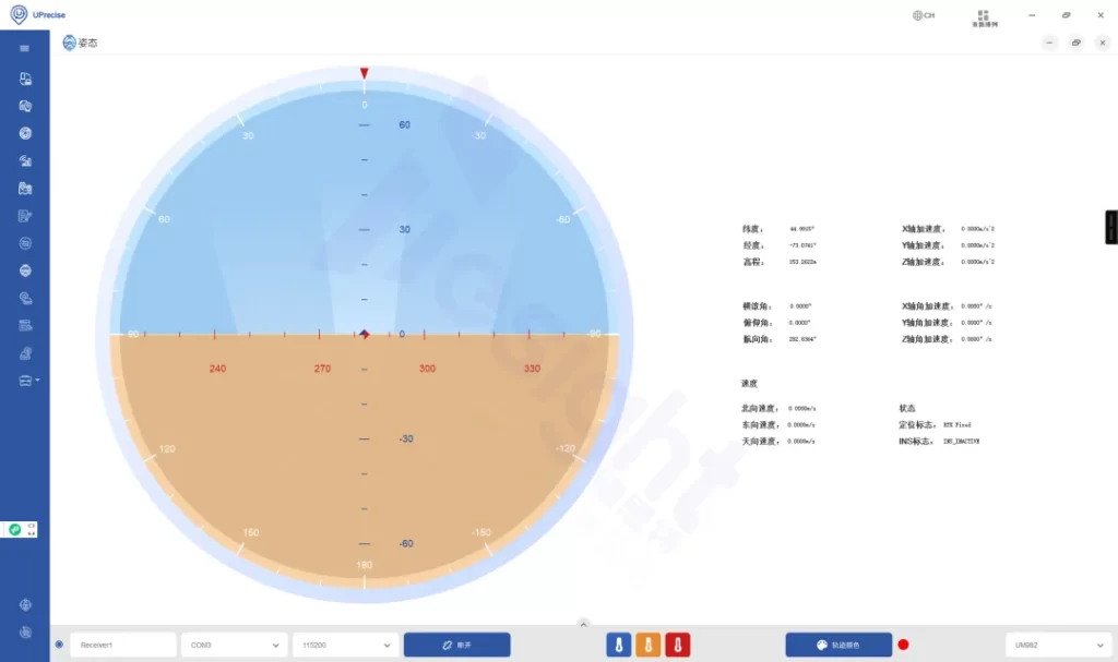 点击“姿态”窗口,可观察到实时航向角(方位角),基本与仿真过程中的方位角一致。