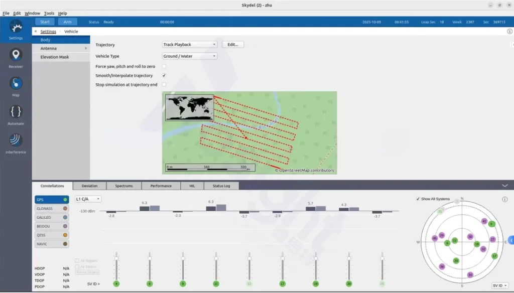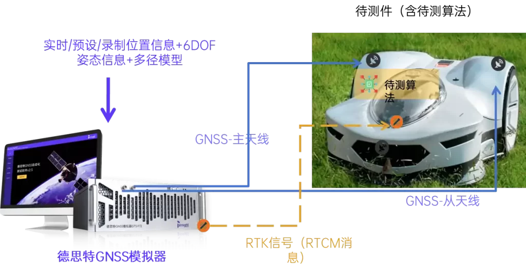 采用德思特GNSS模拟器,该模拟器可生成实时/预设/录制的位置信息、6DOF(六自由度)姿态信息以及多径模型。