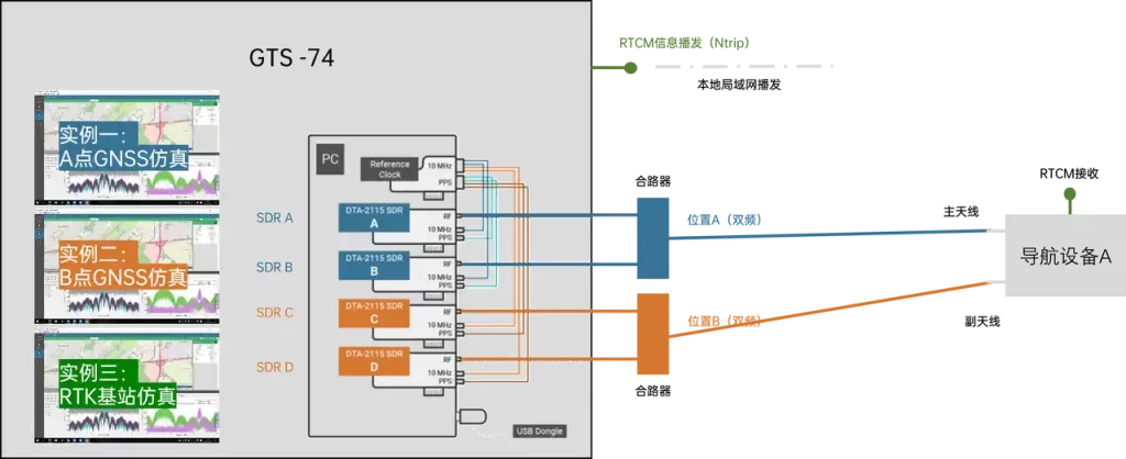 此外,它可以通过多实例功能实现流动站主天线+从天线仿真以及RTK虚拟信号(等同于CORS站信号的仿真,通过WIFI、5G等方式传输)实现RTK定位+双天线定向: