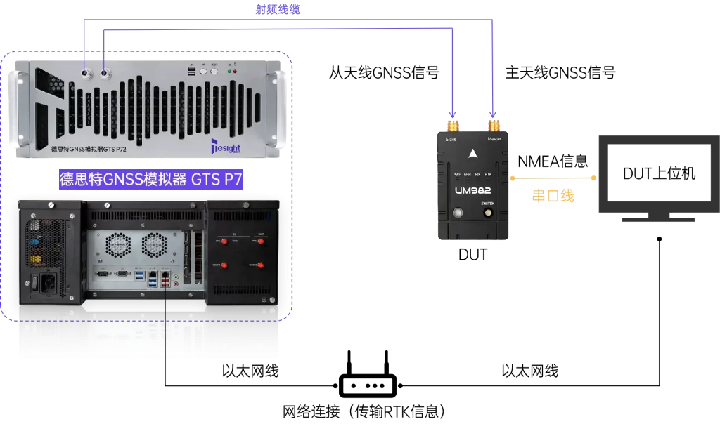 本次我们测试使用的是行业内较为通用的和芯星通UM982模组来进行验证测试。在该测试demo中,我们使用德思特GNSS模拟器GTS-P72的双端口能力来实现对于主从天线的仿真,并采用虚拟基站来进行RTK信息的仿真。