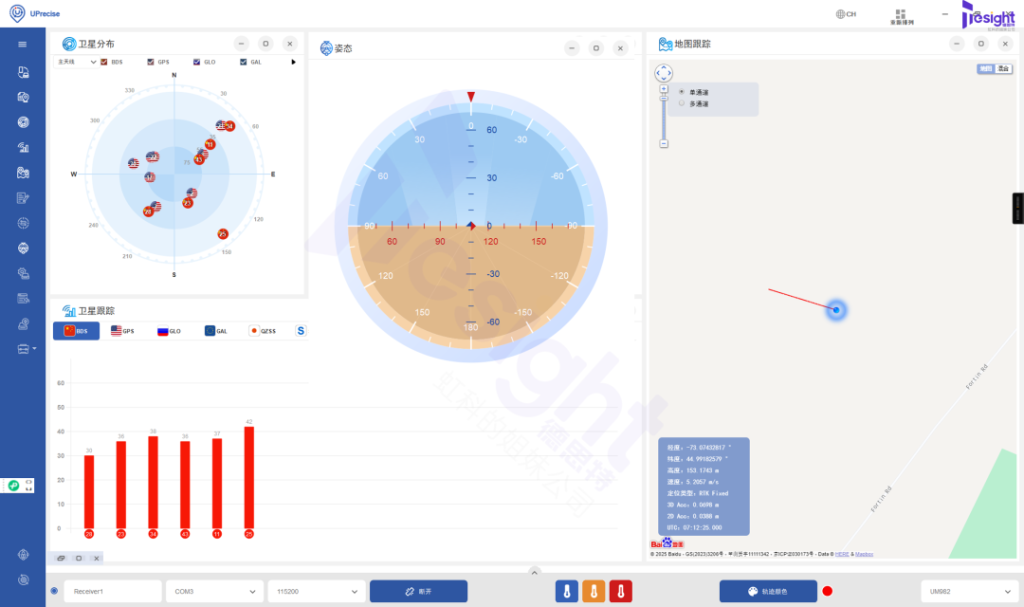 在准备好的PC上连接UM982接收机,打开Uprecise,在上方receiver选择对应串口号,设置波特率模式为:“Autobauding”,等待连接成功。
