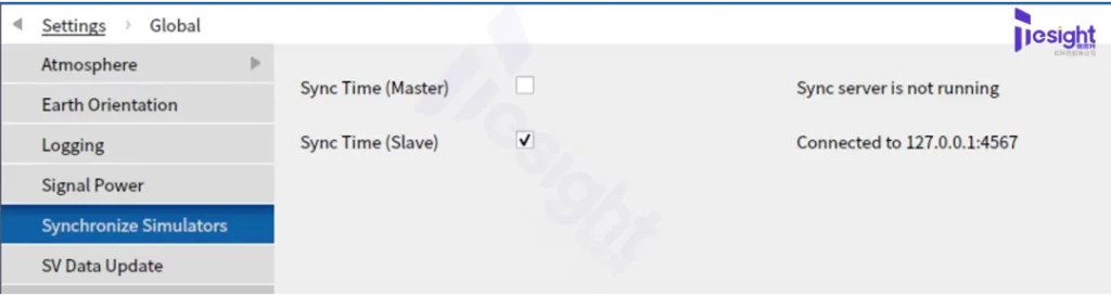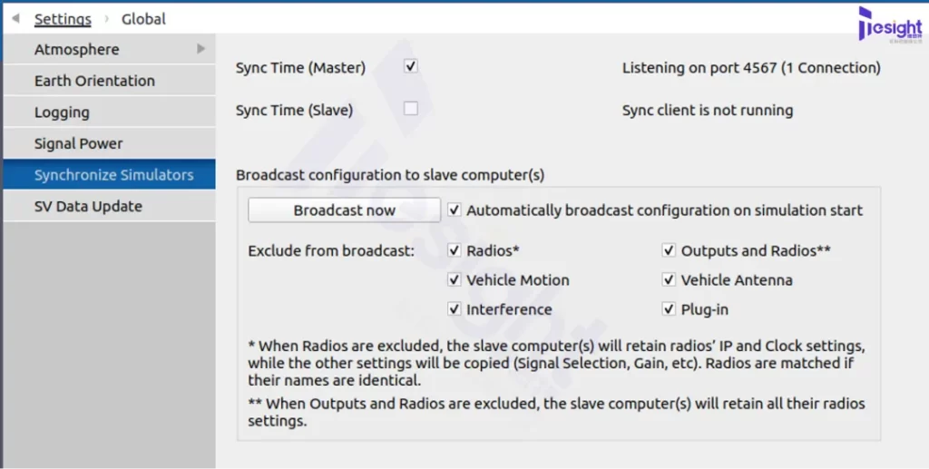 进入Settings设置 -> Global全局 -> Synchronize simulators,设置复选框 Sync Time (Master) ,这将允许参考站模拟与流动站模拟同步开始。设置复选框 “Automatically broadcast configuration on simulation start”。在Exclude一栏,勾选所有选项。