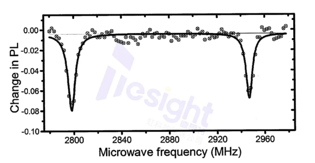 扫频过程的具体机制如下:当微波频率与 NV 色心电子能级的能量差不匹配时,电子聚集在 0 能级上,此时 NV 色心的荧光强度保持在较高水平;而当微波频率接近共振频率时,NV 色心的 0 能级电子会有一部分跃迁到 – 1 能级与 + 1 能级上,表现为 NV 色心的荧光强度降低。