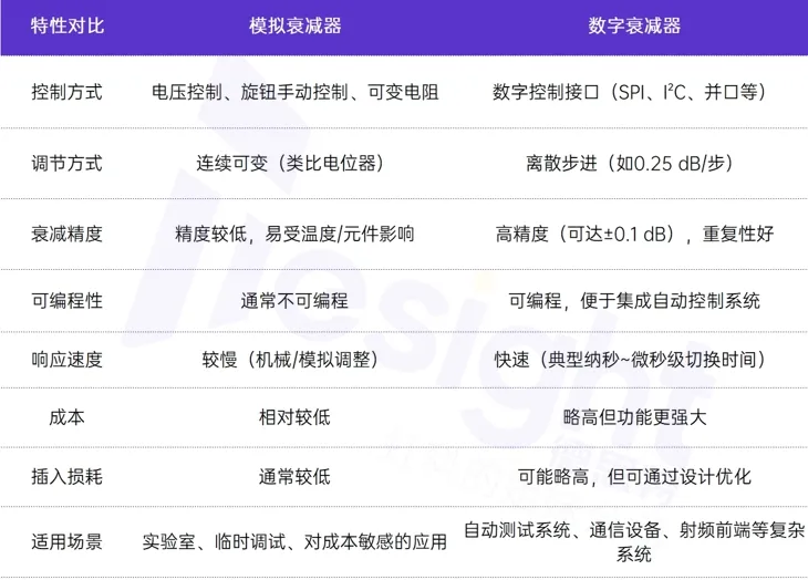 模拟衰减器通常是通过连续的模拟信号来改变衰减值,多采用PIN二极管、可变电阻、或机械结构(手动旋钮等)实现,其衰减量通常是连续可调,可以实现快速、平滑的功率控制。然而,其控制精度较低,不容易达到0.5dB量级,且衰减量通常受控制电压或温度的影响较大,需要复杂的校准和查表补偿才能获得较高的精度。此外,由于模拟电路的漂移特性,其重复性通常不如数字器件,故一致性和可重复性差。