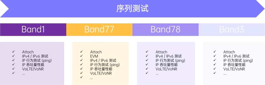 可测试同一基站下,定义不同的测试频段,以及定义需要测试的项目有哪些。并进行序列测试。且可以将序列测试保存为脚本,打开即用。也可理解为支持用户自定义测试模板